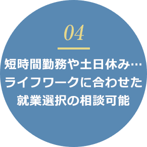 短時間勤務や土日休みなどライフワークに合わせた就業選択の相談可能 |